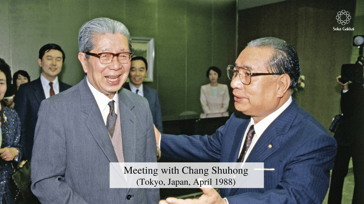 En 1980, Daisaku Ikeda visitó China y mantuvo conversaciones con Chang Shuhong, quien se desempeñaba entonces como director de la Academia de Dunhuang. Durante ese encuentro dialogaron sobre la Ruta de la Seda, la cultura budista y el arte de las grutas de Mogao. El maestro Ikeda manifestó una profunda curiosidad por el arte de las cuevas y destacó especialmente la labor del director Chang en su conservación. De esas conversaciones surgieron coincidencias en torno a valores compartidos, como la prosperidad de la humanidad, la paz mundial y la responsabilidad del budismo frente a la sociedad.