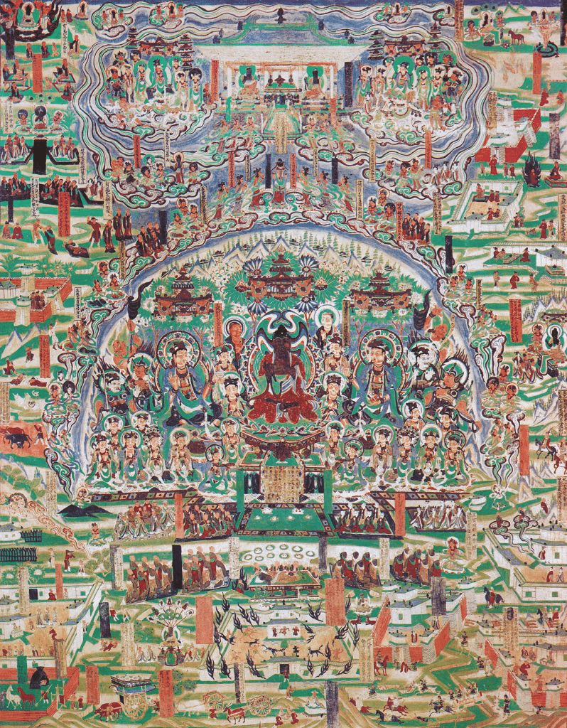 Veintidós de los 28 capítulos del Sutra del loto están representados en esta pintura, del período de las Cinco Dinastías (primera mitad del siglo X).