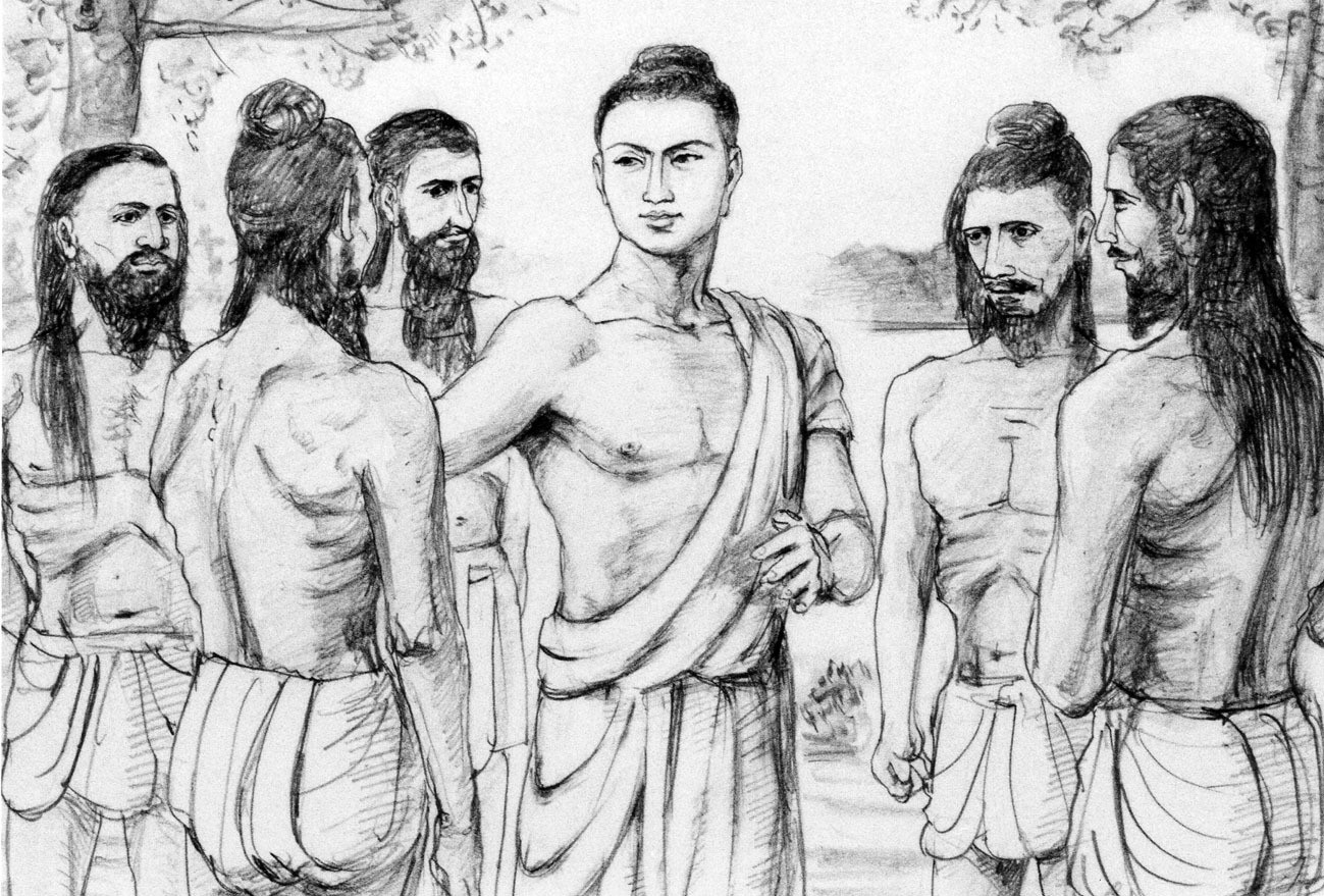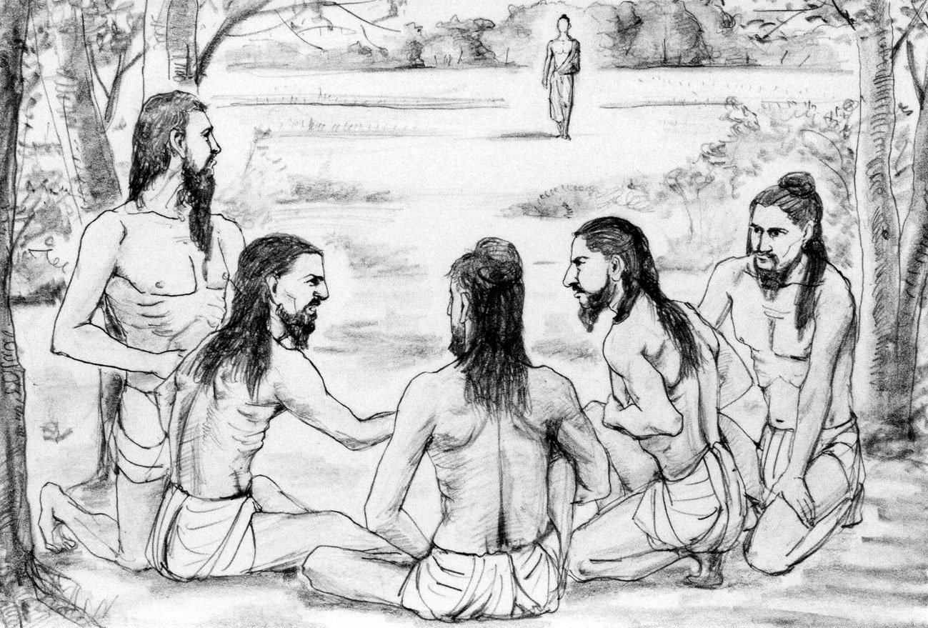 Los cinco ascetas observaron con frialdad la silueta de Shakyamuni que se aproximaba, permanecieron sentados en silencio, observando con empaque gélido. Shakyamuni caminaba con gran dignidad. Se acercó, y les dirigió la palabra sonriendo. A pesar de sí mismos, todos se pusieron de pie. La voz poseía una fuerza tan atrayente, que no pudieron ignorarlo.